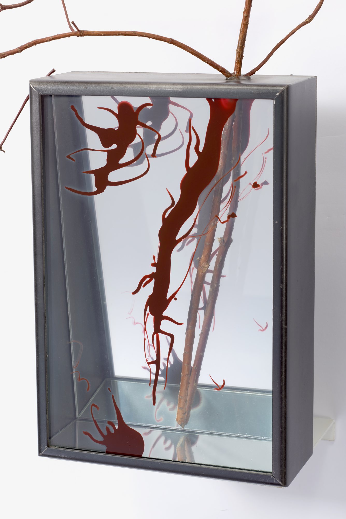 Laca sobre vidrio, espejo, hierro y rama de cerezo, 100 x 82 x 8,5 cm