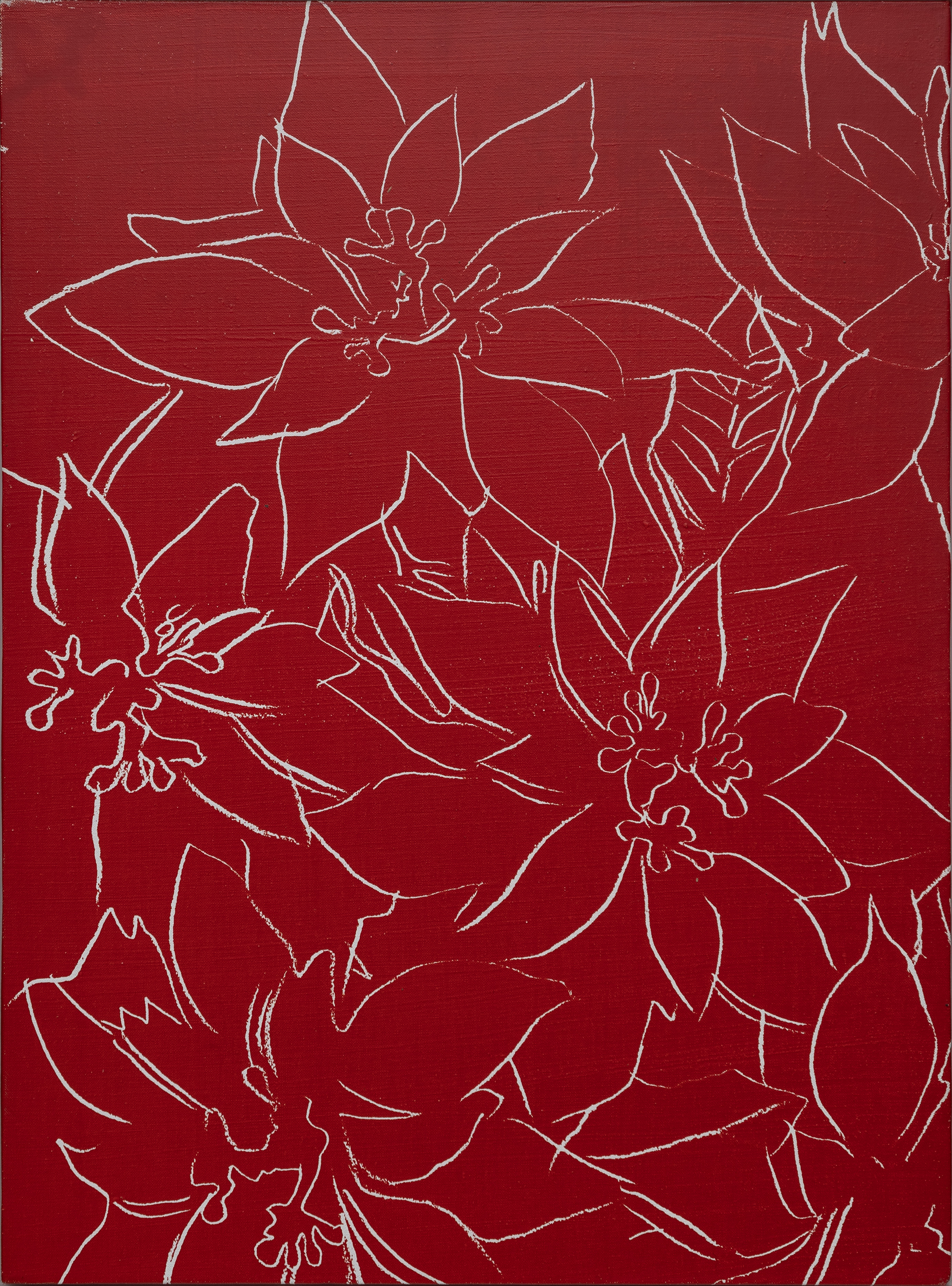 A principios de la década de 1980, Warhol creó varios cuadros de Poinsettia o flor de Pascua, para regalar a sus amigos por Navidad. En este caso, la obra presenta un ramillete de flores de Pascua retratadas con líneas claras y distintivas en tinta blanca sobre un fondo oscuro neutro, lo que permite resaltar los contornos utilizando una línea minimalista sin menoscabar su presencia. El diseño refleja el enfoque característico de Warhol, mezclando sencillez e intensidad captando la esencia de las flores. La elección de la flor de Pascua, con sus connotaciones festivas y ornamentales, refleja el interés de Warhol por los elementos cotidianos que son transformados y repetidos en la cultura de masas, desdibujando las fronteras entre el arte elevado y los objetos de consumo masivo de carácter “decorativo”.