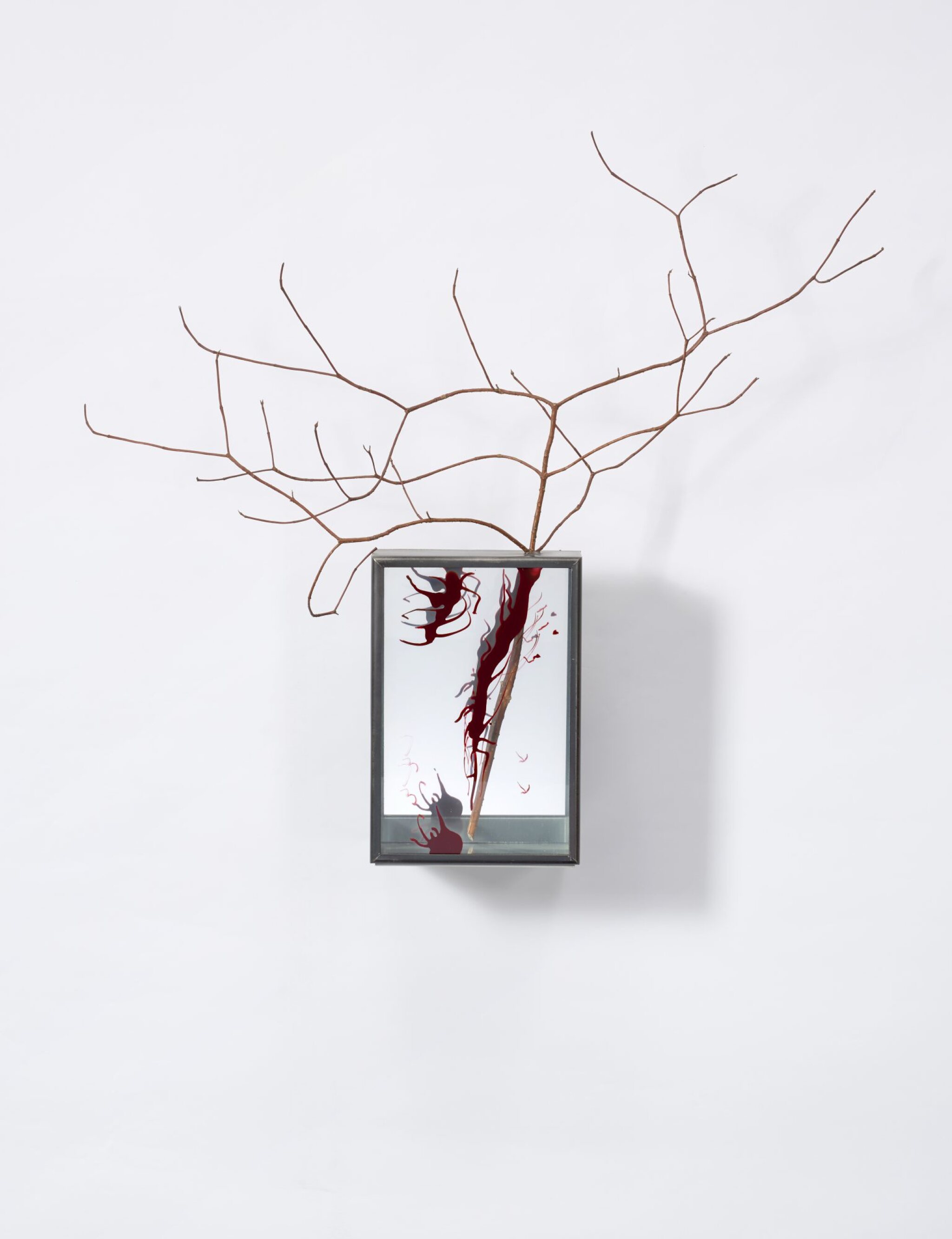 Laca sobre vidrio, espejo, hierro y rama de cerezo, 100 x 82 x 8,5 cm